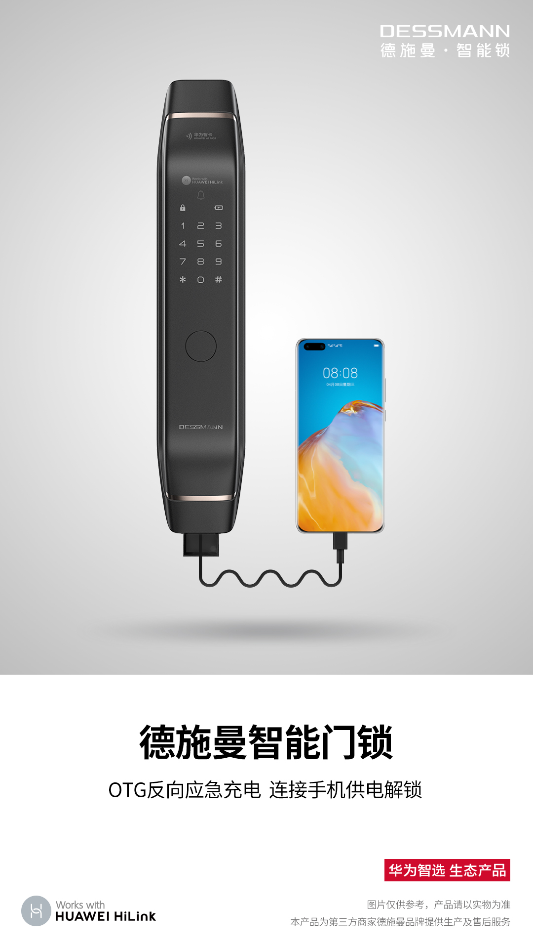 更人性化的是,門鎖底部自帶Type-C電源線,門鎖沒電時還可直接連接華為手機實現反向充電,為門鎖供電解鎖。