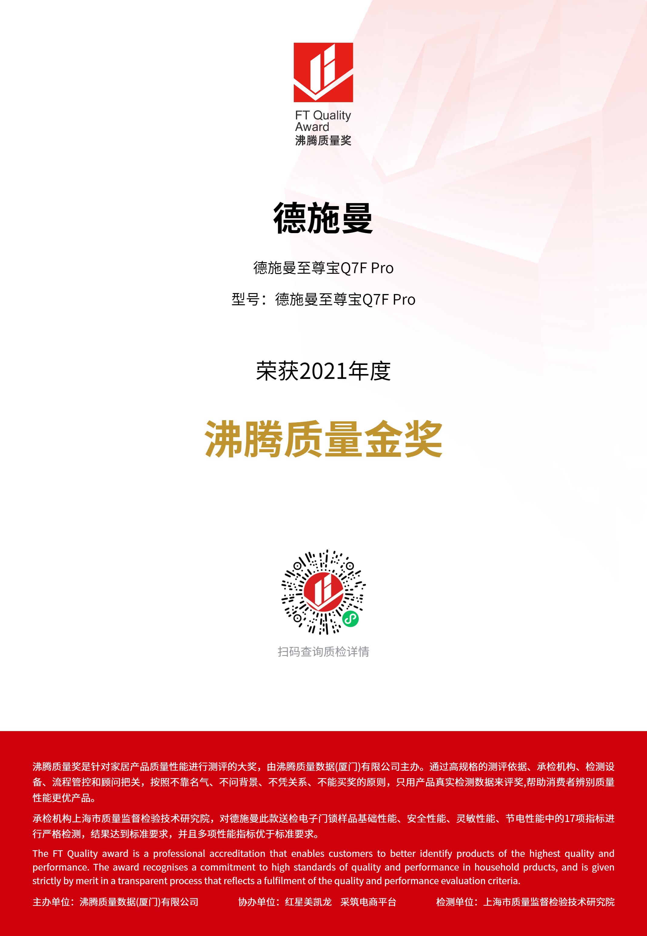 2022年3月15日,備受家居行業和市場矚目的2021年度沸騰質量獎測評獲獎結果,在“3·15家居品質節暨沸騰家居質量周”上重磅揭曉。德施曼3D人臉視頻鎖至尊寶Q7FPro榮獲“沸騰質量金獎”、貓眼款至尊寶Q7M獲“安全電子門鎖標桿獎”、至尊寶Q7獲“靈敏電子門鎖標桿獎”、天鵝Q2獲“節電電子門鎖標桿獎”。德施曼“沸騰質量獎”再添一項金獎、三項品質大獎!