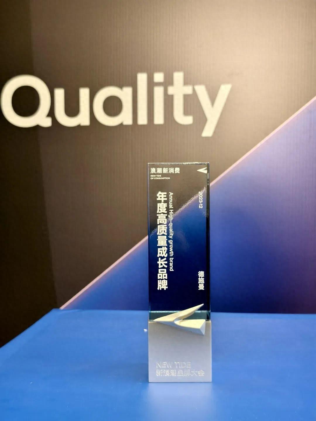 在大會的榮耀環節“新浪潮年度頒獎盛典”上,德施曼斬獲“高質量成長品牌”大獎,與網易嚴選、喜茶、極米科技、Babycare等領軍品牌共同入選新浪潮2023年度高質量成長品牌榜,共繪新消費的“群星閃耀”時刻!