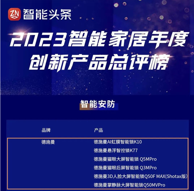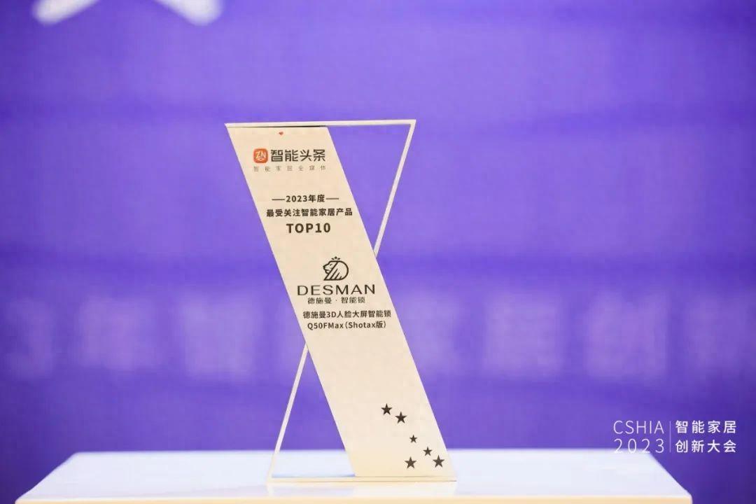 其中,德施曼3D人臉大屏智能鎖Q50FMax(Shotax版)斬獲“2023年度最受關(guān)注智能家居產(chǎn)品TOP10”大獎、掌靜脈大屏智能鎖Q50MVPro斬獲“鼎智獎·年度智能家居創(chuàng)新產(chǎn)品獎”大獎;德施曼6款年度產(chǎn)品實力上榜,領(lǐng)跑智能鎖行業(yè)。