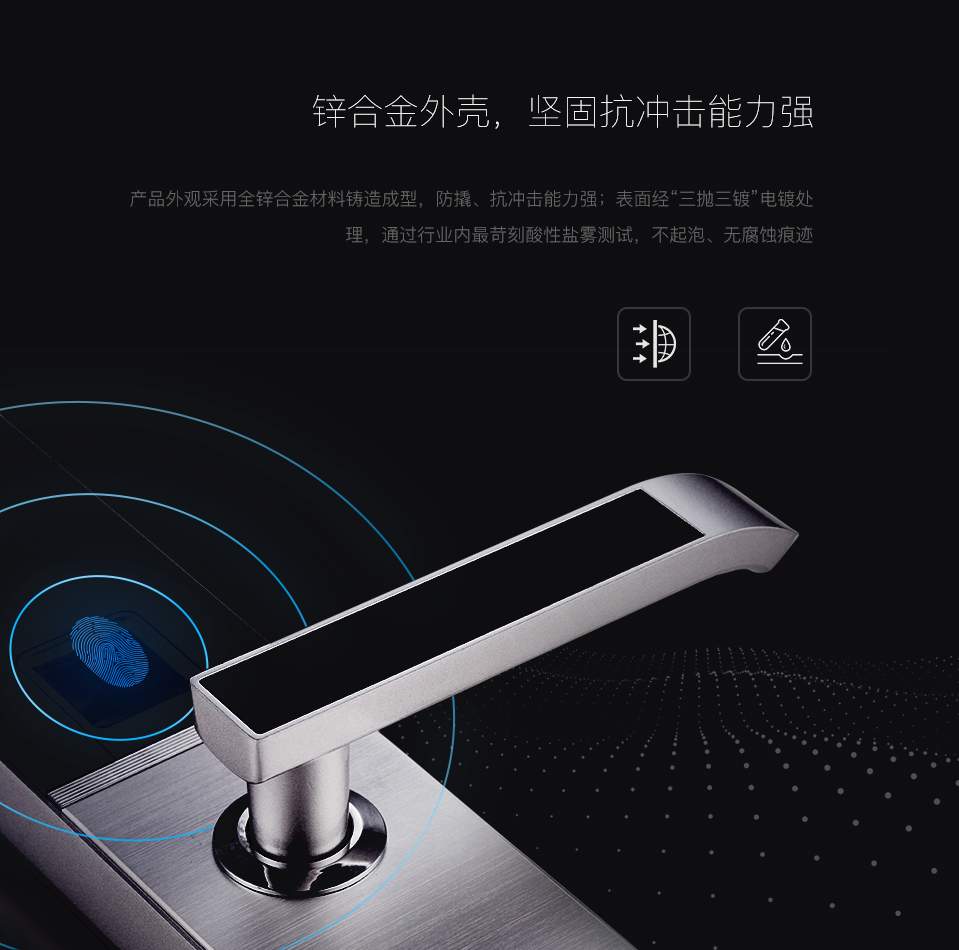 產品外觀采用全鋅合金材料鑄造成型,防撬、抗沖擊能力強;表面經“三拋