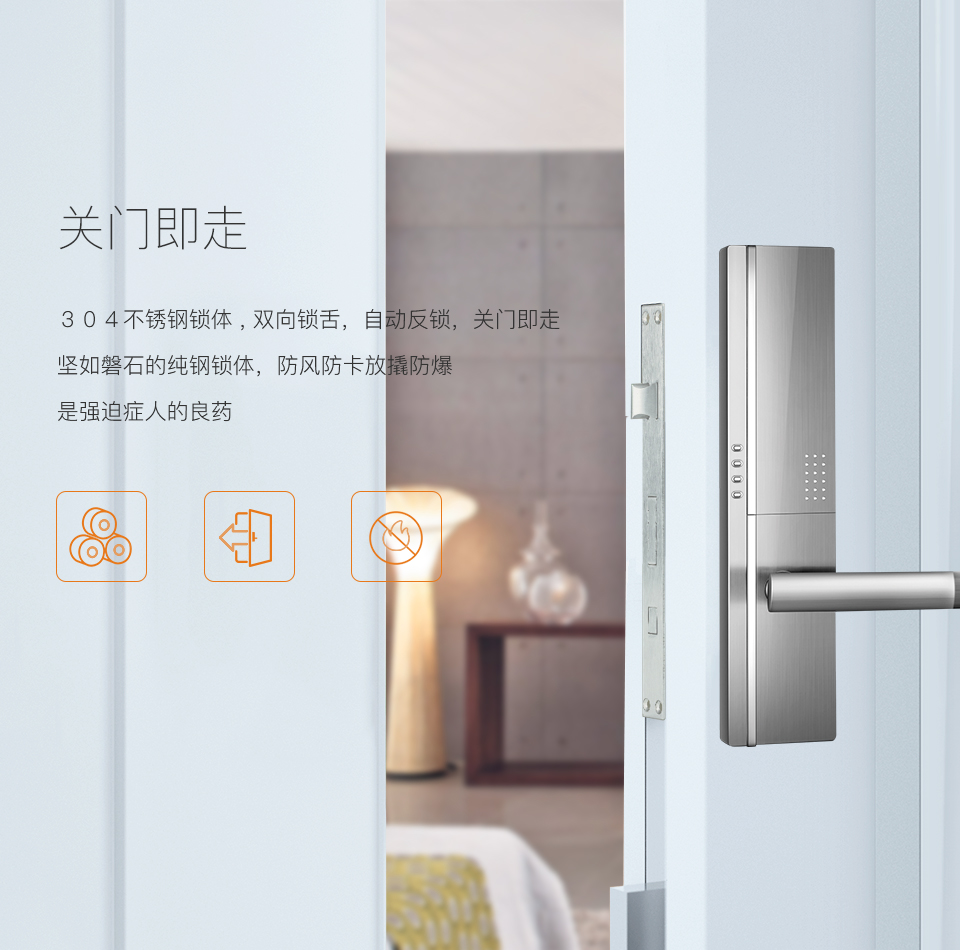 304不銹鋼鎖體 , 雙向鎖舌,自動反鎖,關(guān)門即走